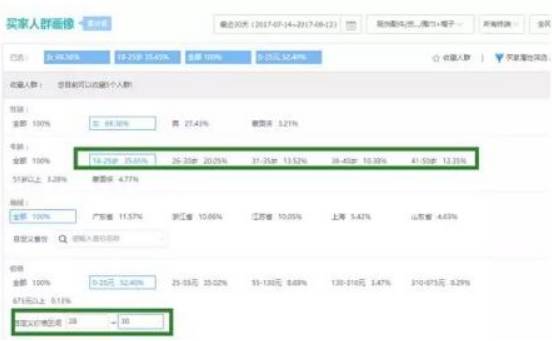 我们可以在“大檐草帽”买家人群画像里看到年龄占比,可以看到18-25岁和26-30岁总共占比55.7%,是最多的,然后我们在买家人群中选取我们刚才定好的价格。